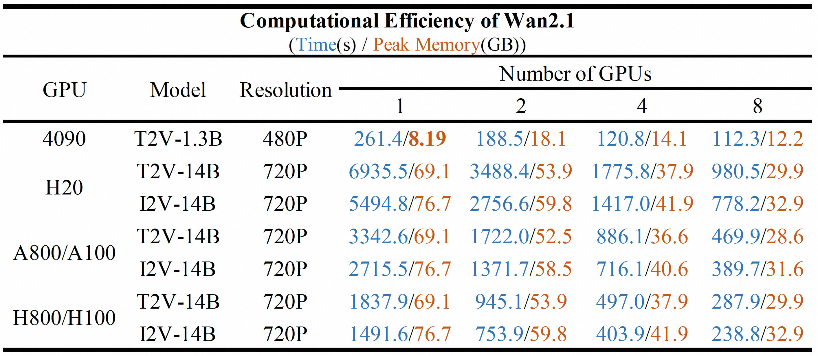We test the computational efficiency of different Wan2.1 models on different GPUs in the following table. The results are presented in the format: Total time (s) / peak GPU memory (GB).